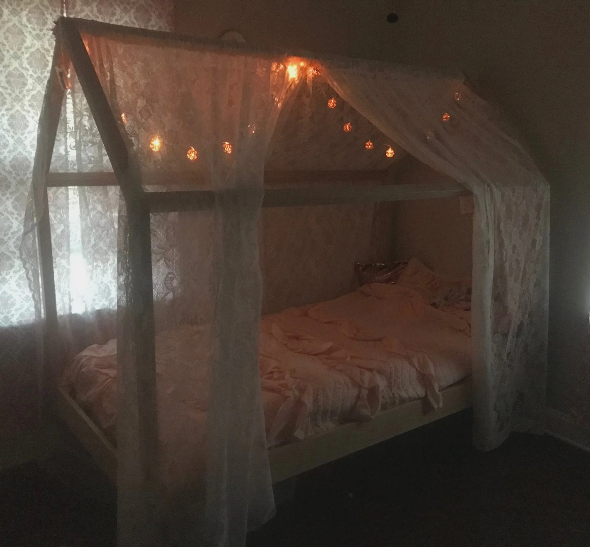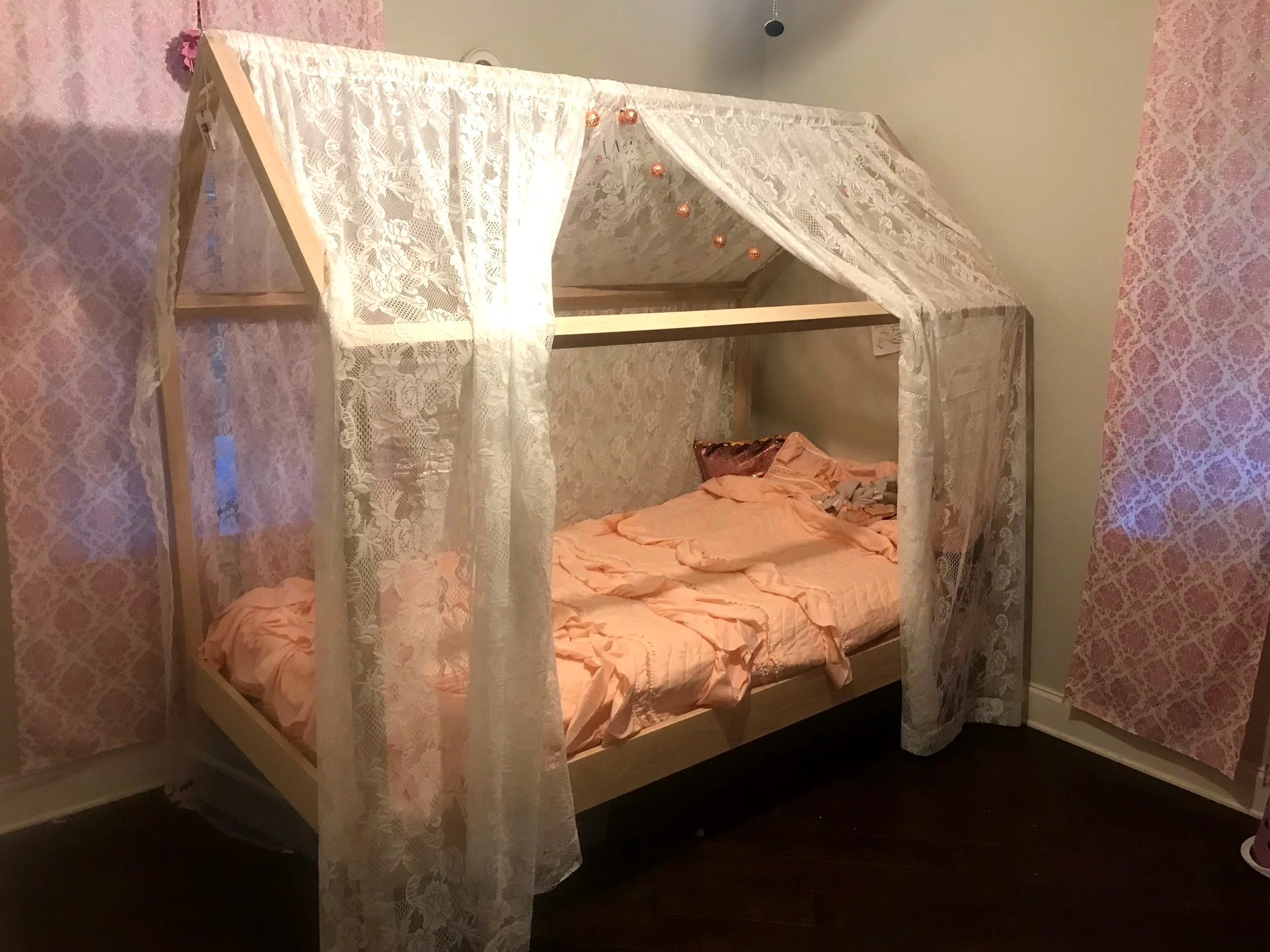 This is a bed that I made for one special little girl. The bed is shaped as a little house and is outfitted with internal LED lighting. Due to specifically designed joinery, the bed can be easily knocked down for transportation.